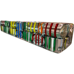 Latas de pintura de diferentes colores, cortadas y encapsuladas en resina transparente, boleada, lijada y pulida a mano.
